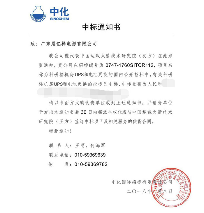 中國運(yùn)載火箭技術(shù)研究院作為我國首屈一指的國防科研單位,其設(shè)備采購及供應(yīng)商選擇都有著嚴(yán)格的標(biāo)準(zhǔn),不僅要求競標(biāo)企業(yè)提供的產(chǎn)品符合其特定的技術(shù)規(guī)范,還需對競標(biāo)企業(yè)品牌、價格、服務(wù)、信譽(yù)等方面進(jìn)行全方位的評審,經(jīng)過國內(nèi)多家電源廠商的激烈角逐,最終確認(rèn)恩億梯成功中標(biāo),目前公司已收到中標(biāo)通知書。
